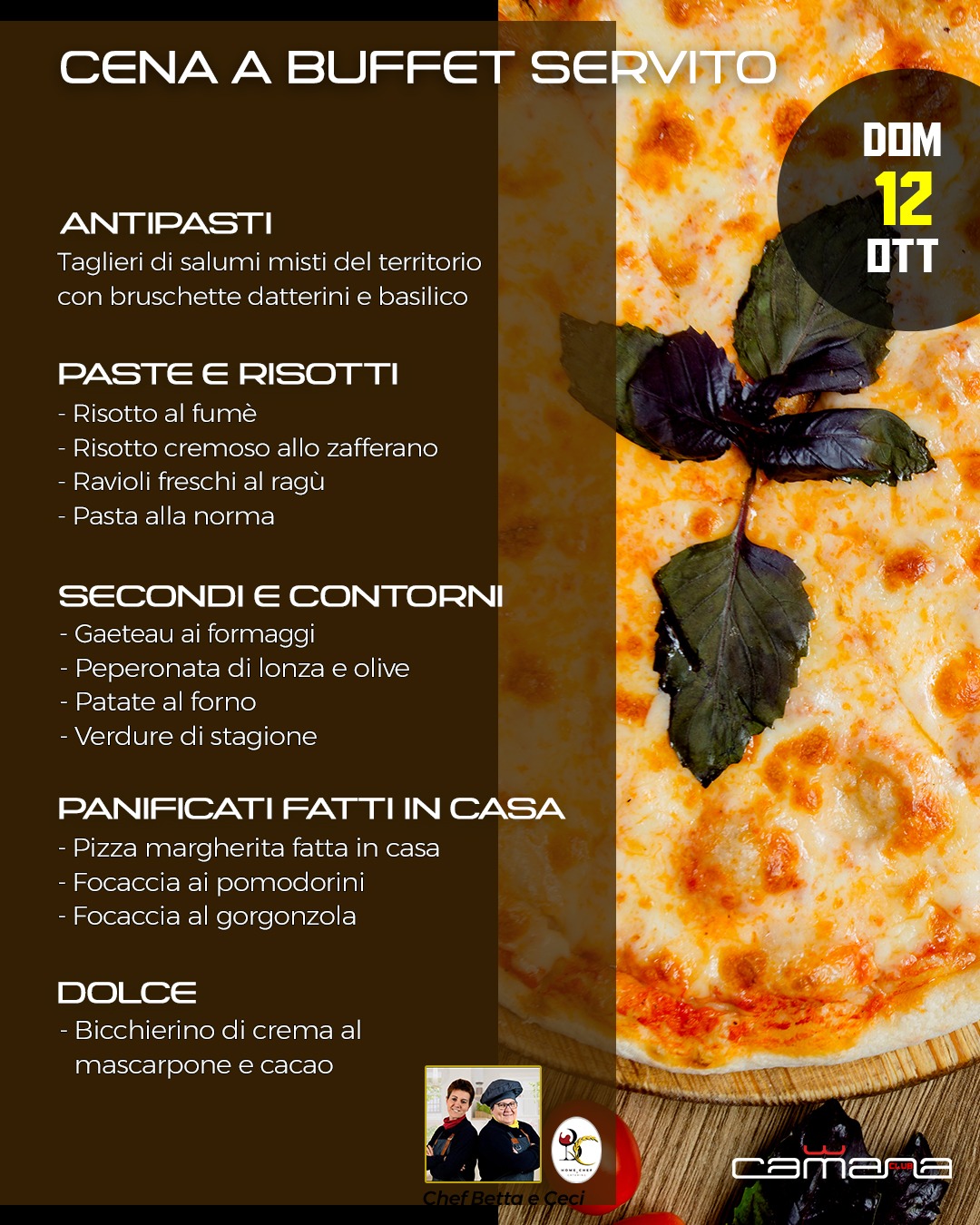- h 19.30: Cena a Buffet Servito + Serata (€20 con drink e guardaroba)