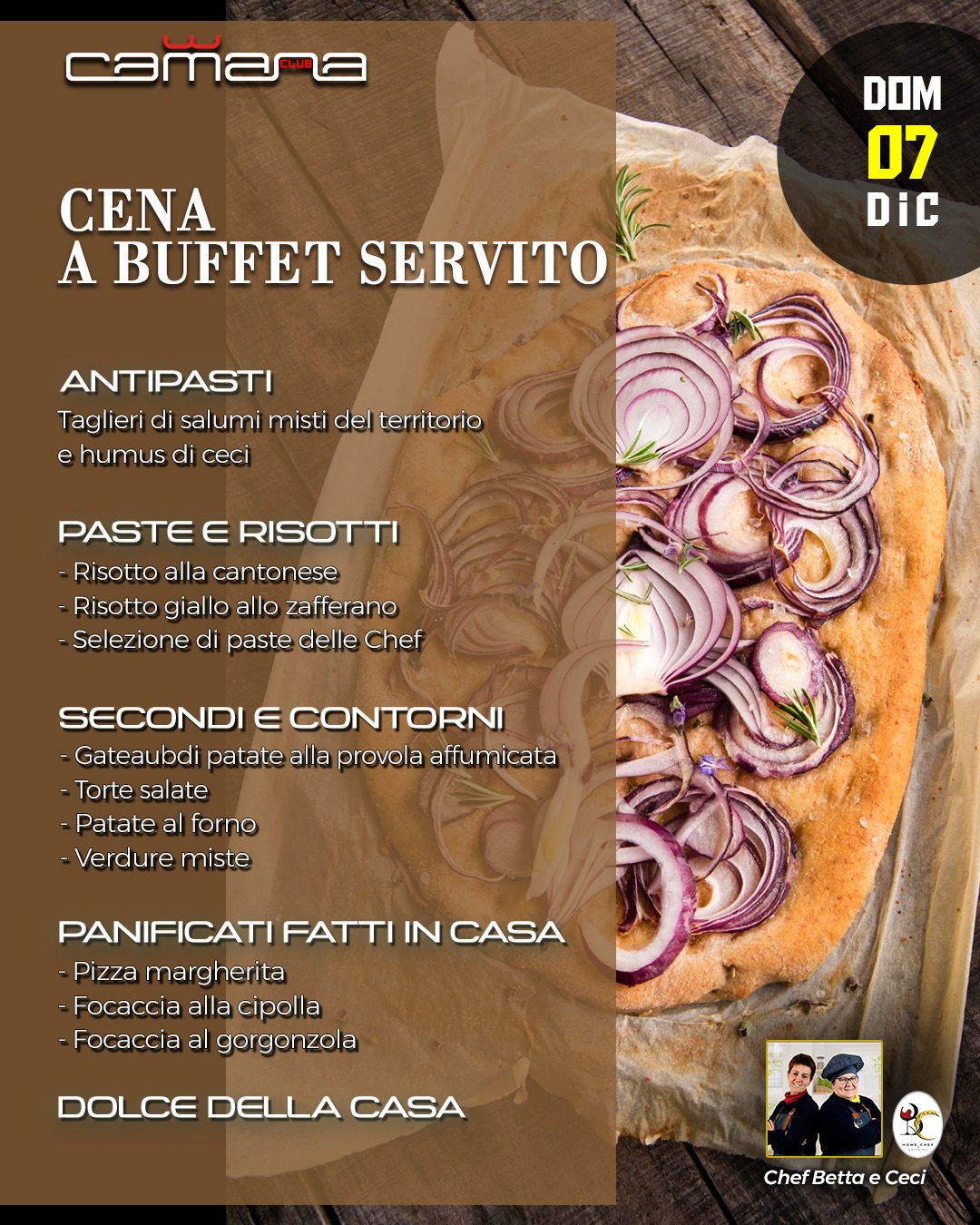 • h 19.30: Cena a Buffet Servito + Serata (€23 con drink e guardaroba)