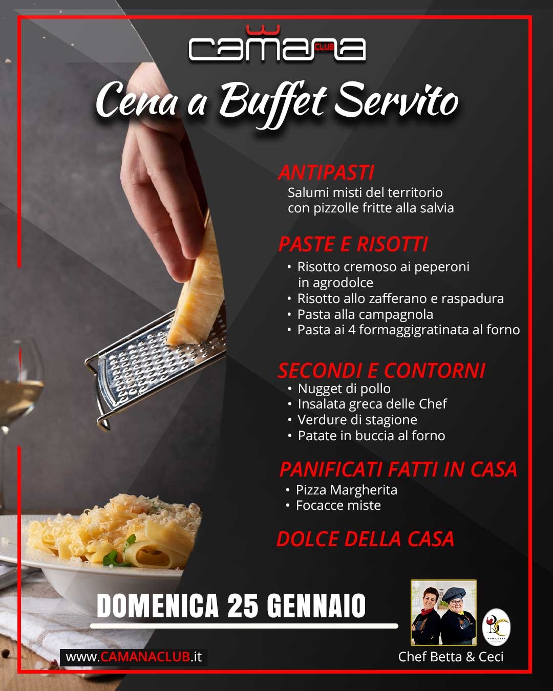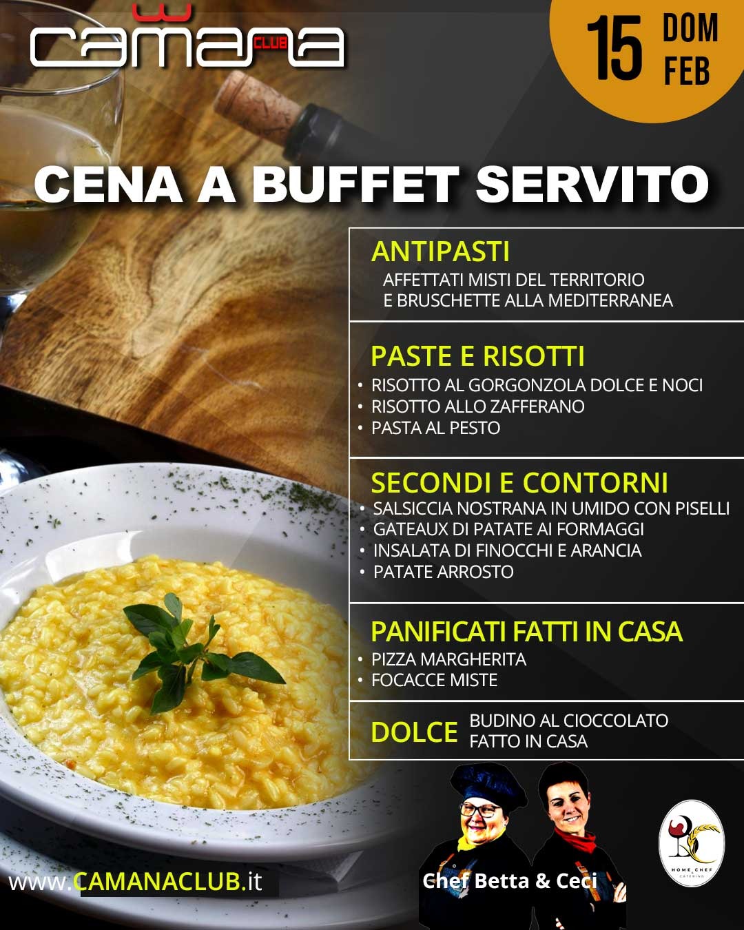 - h 19.30: Cena a Buffet Servito + Serata (€23 con drink e guardaroba)